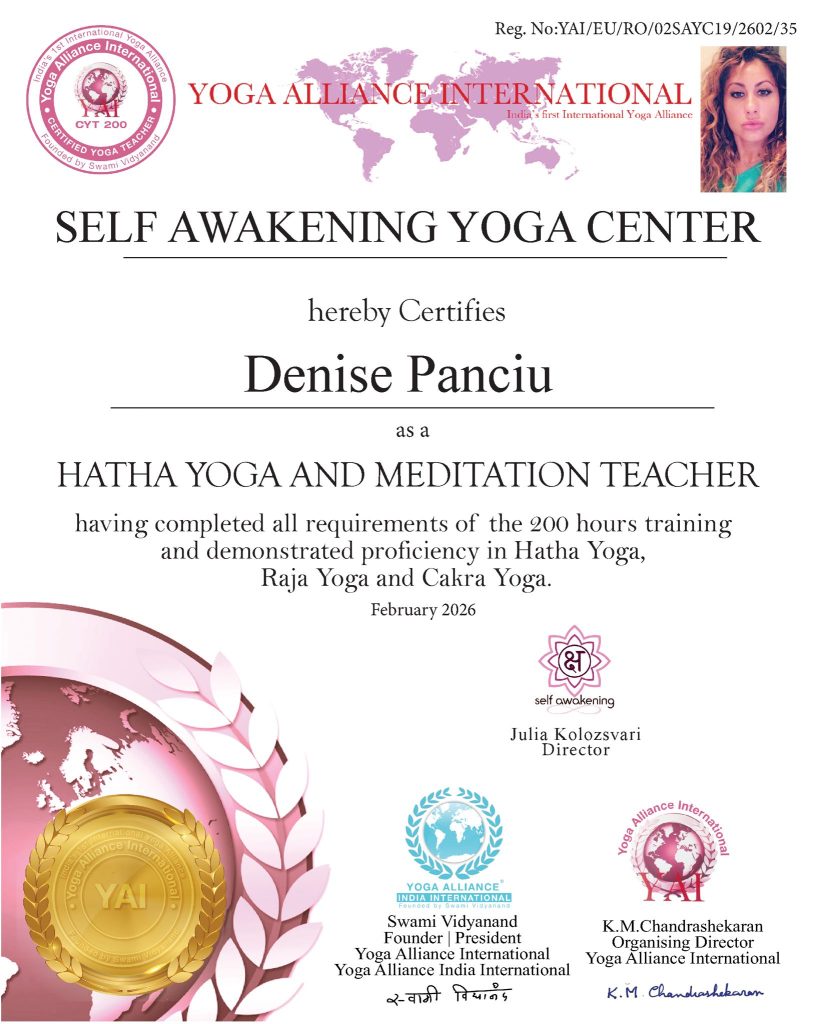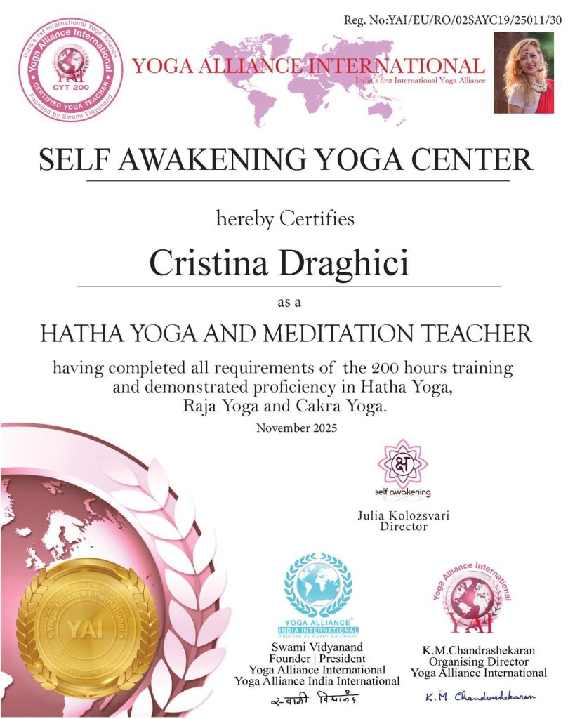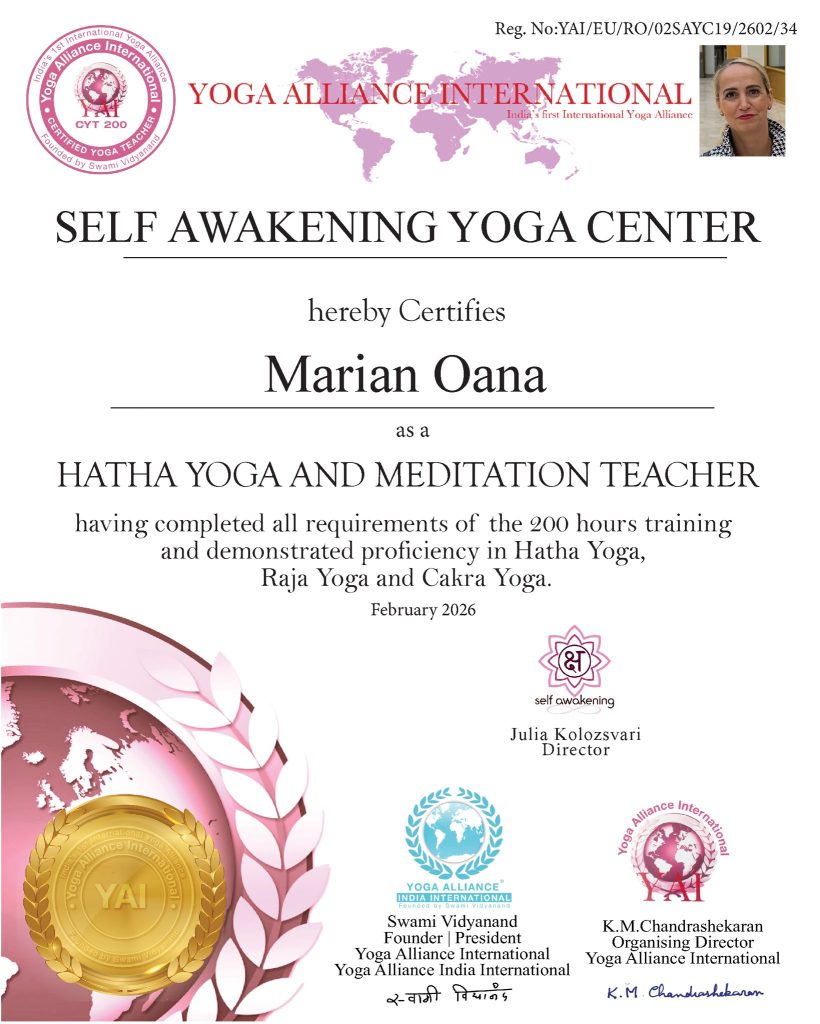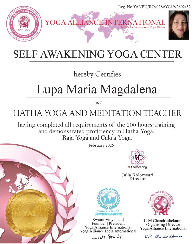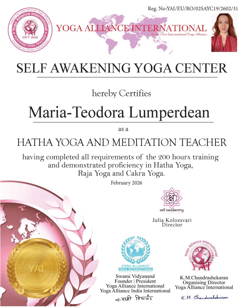 “Pentru mine cursul de instructori de yoga a fost o oportunitate de a mă redescoperii intr-un mod autentic. Prin practicarea corectă, atentă si perseverentă a practicilor yoghine, am invațat și continui să învăț, să am control asupra propriei mele vieți și să ii dau direcția dorită. Prin toate aceste tehnici avem șansa să fim mai mult decat am fost ieri. Si astfel putem decide cine vom fii mâine.